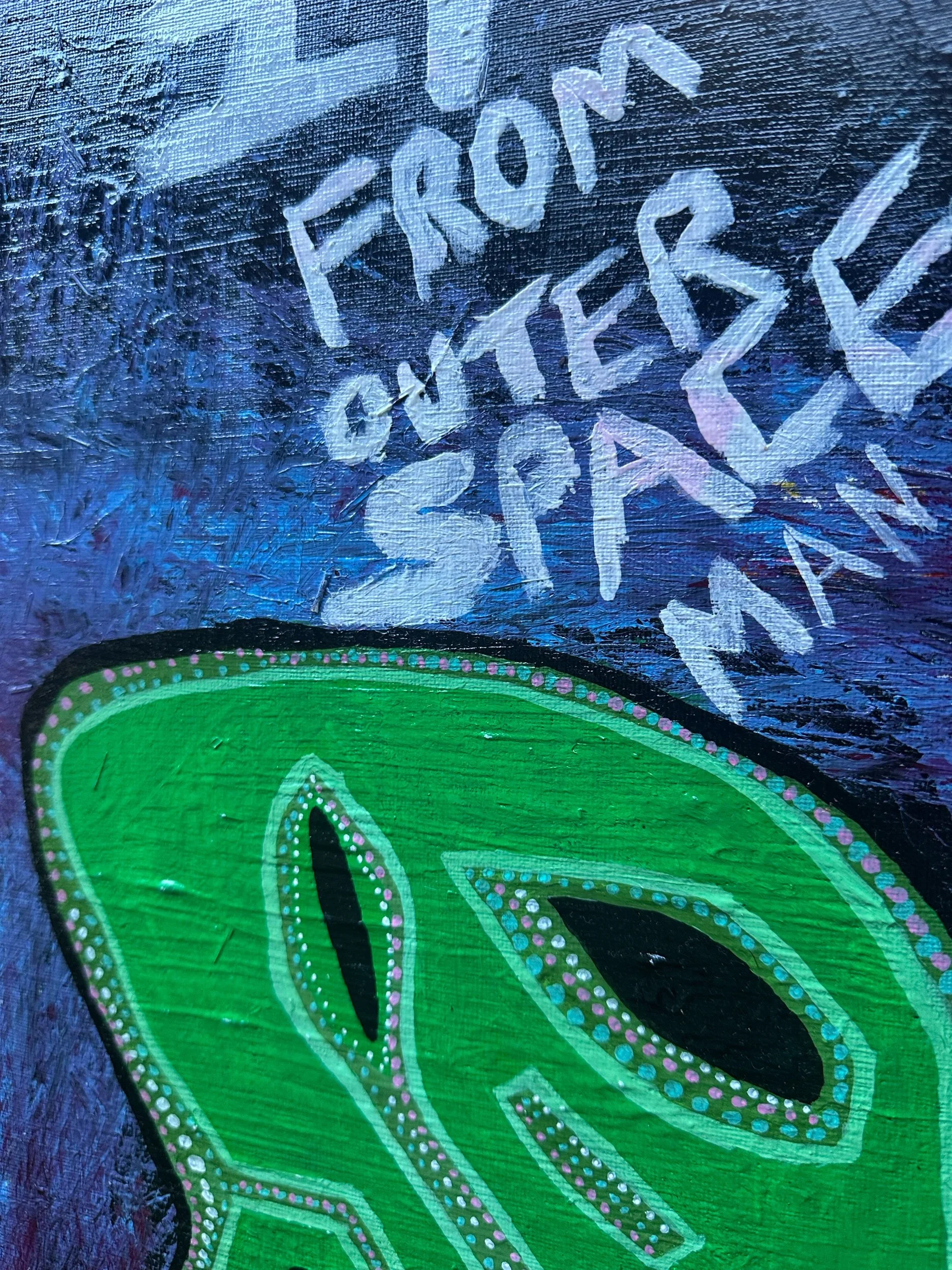 Image 1 of 2 Image 2 of 2 I'M FROM OUTER SPACE MAN $200.00 Acrylic paint and marker on canvas 38cm x 38cm.Painted over the top of one of my mother’s old pieces she didn’t care for. Add To Cart Added! Acrylic paint and marker on canvas 38cm x 38cm.Painted over the top of one of my mother’s old pieces she didn’t care for.
