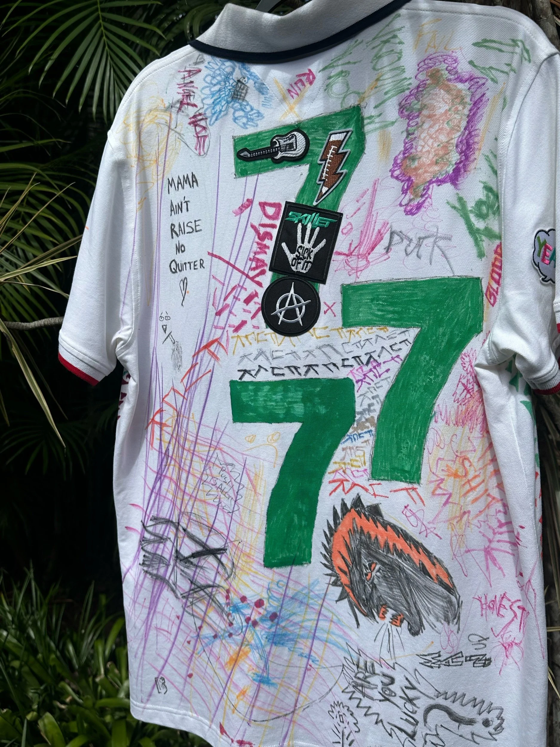 Thrifted item washed and hand customized with fabric markers and iron-on patches. Technically a men’s XL but I think it’ll look hot on anyone.