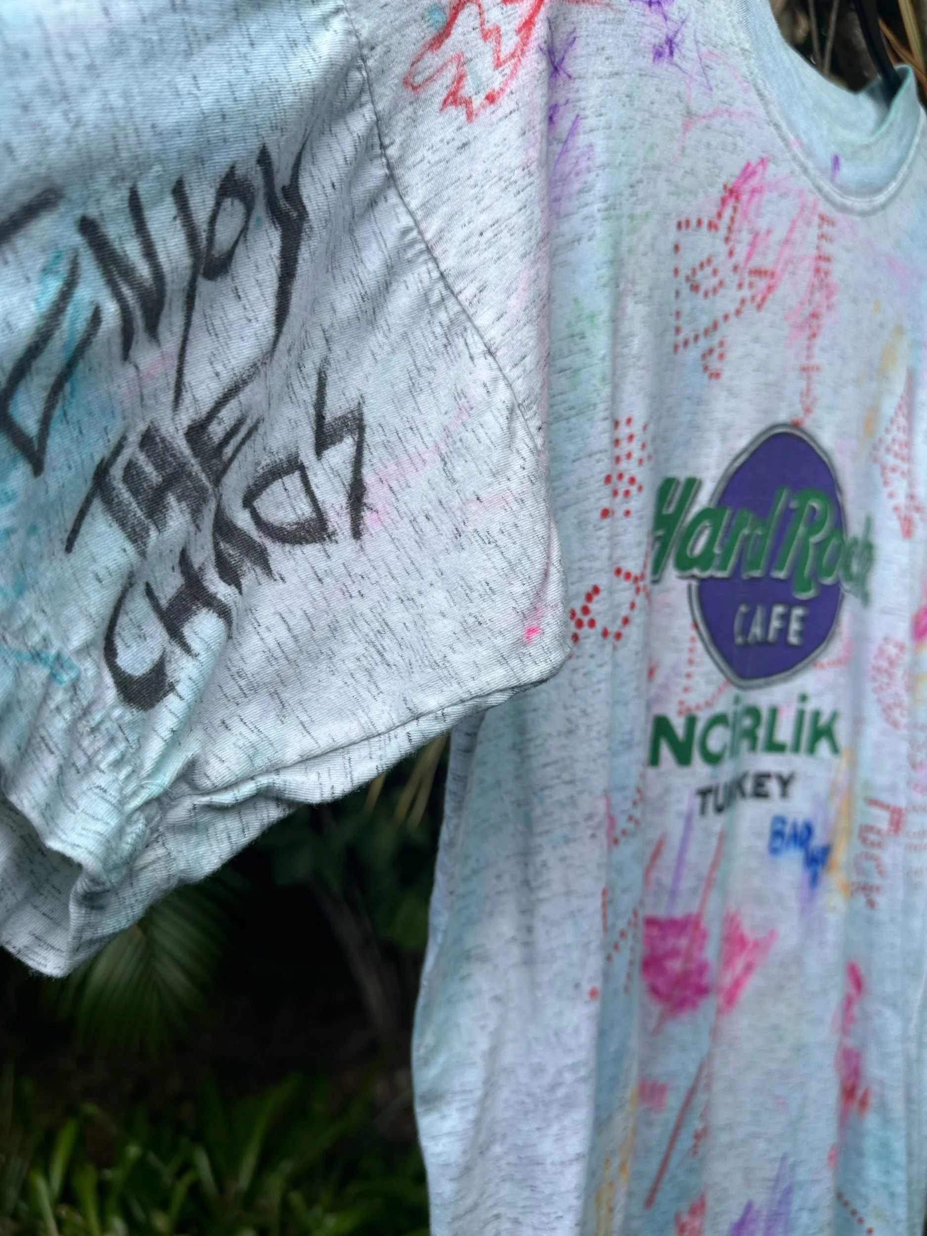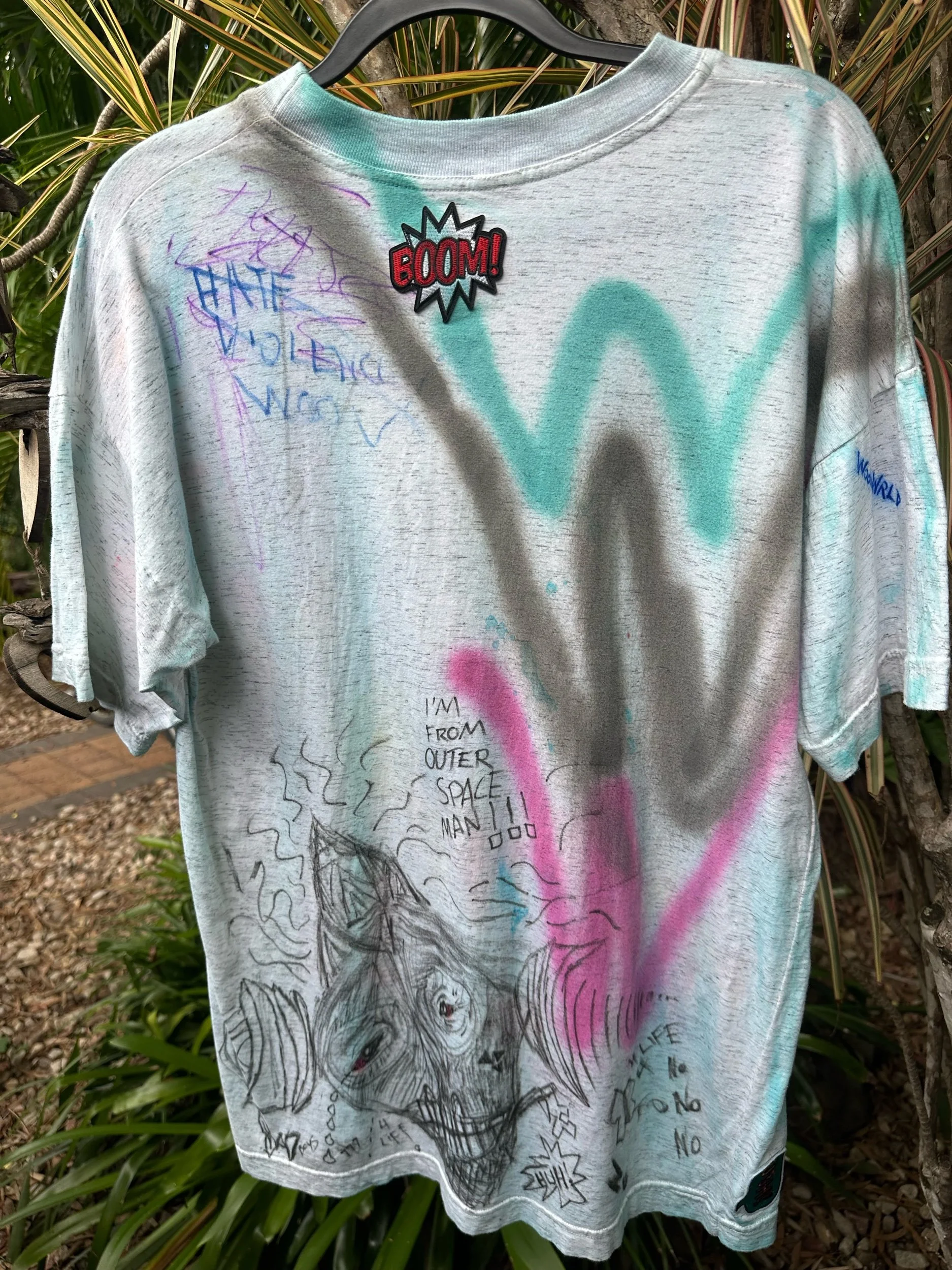 Thrifted item, washed and hand customized with fabric markers, paint pens, spray paint and iron-on patches.