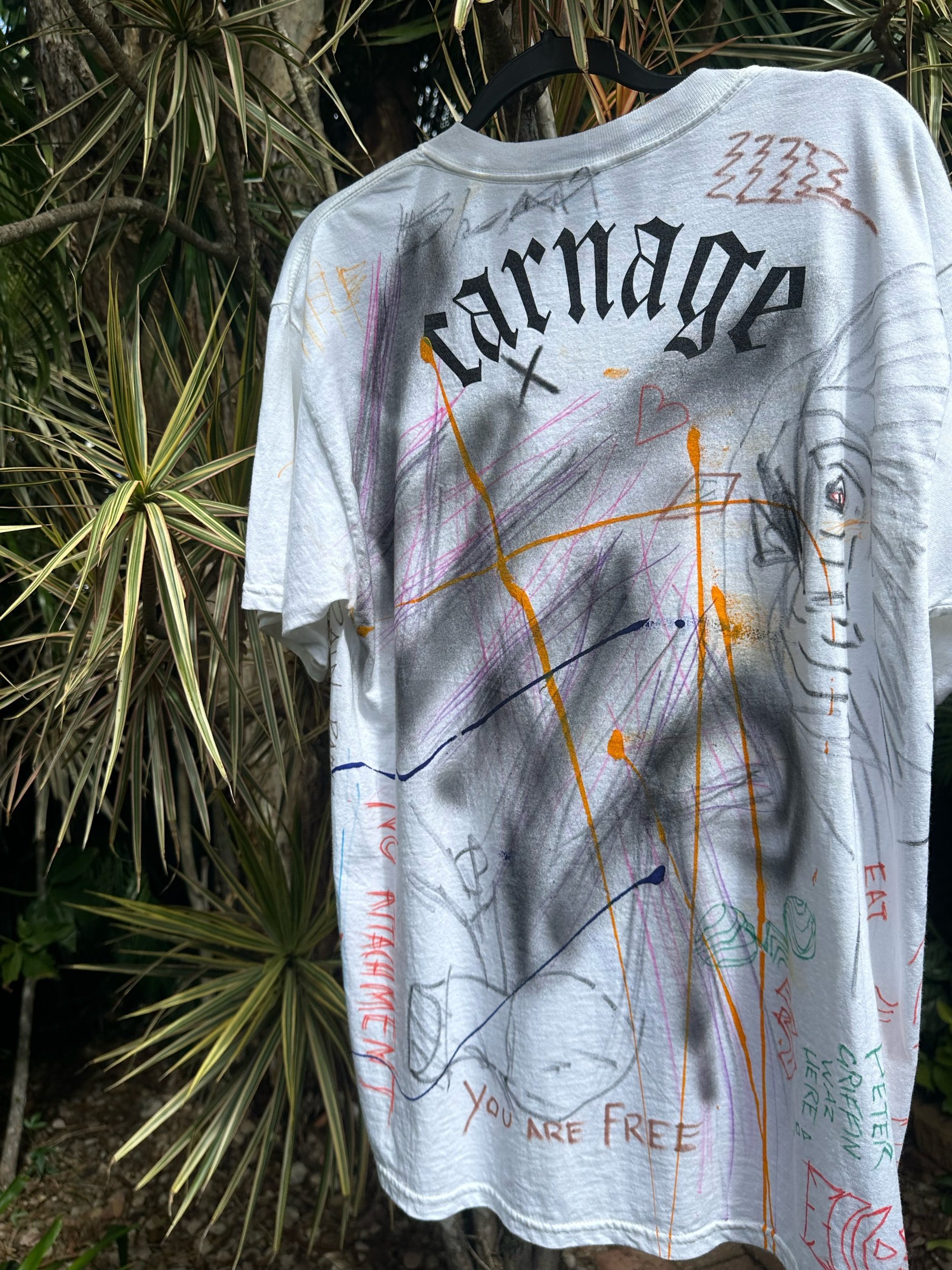 Thrifted tee washed and hand customized with markers, acrylic paint, spray paint and iron-on patches.